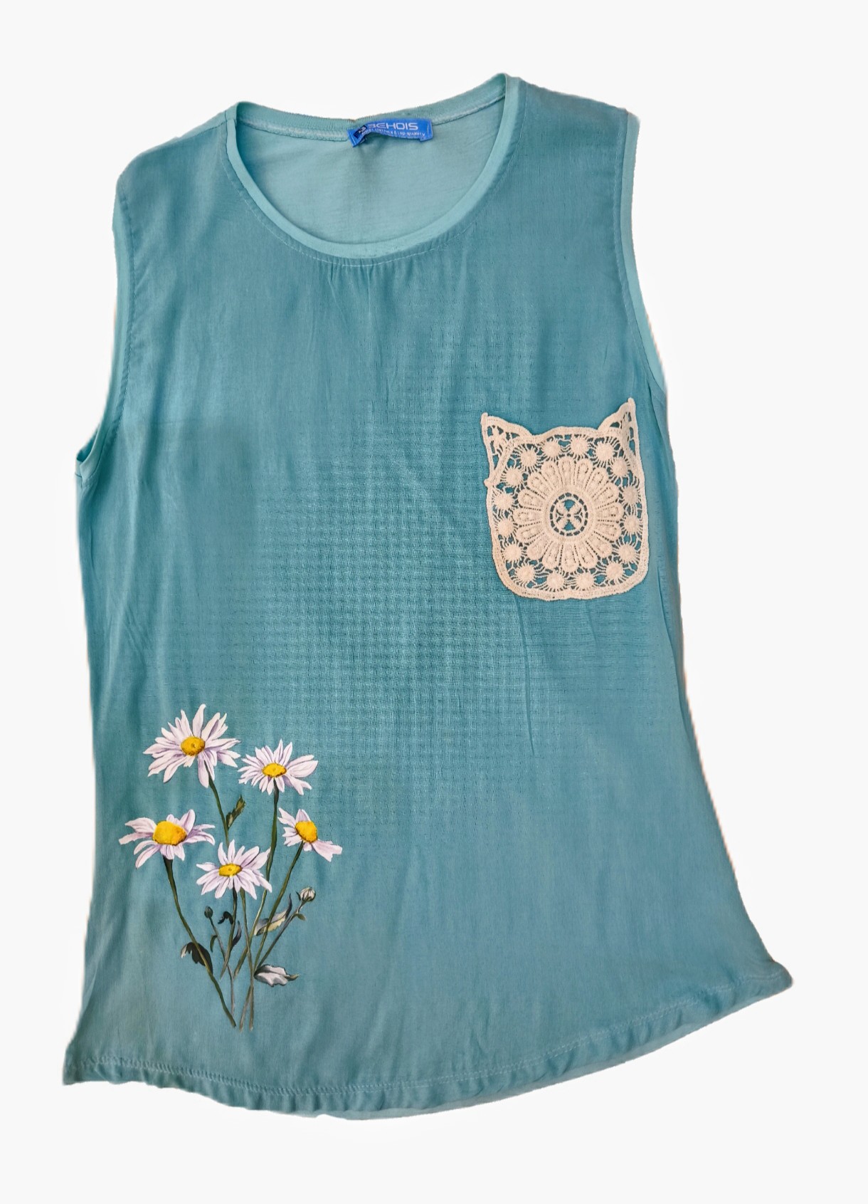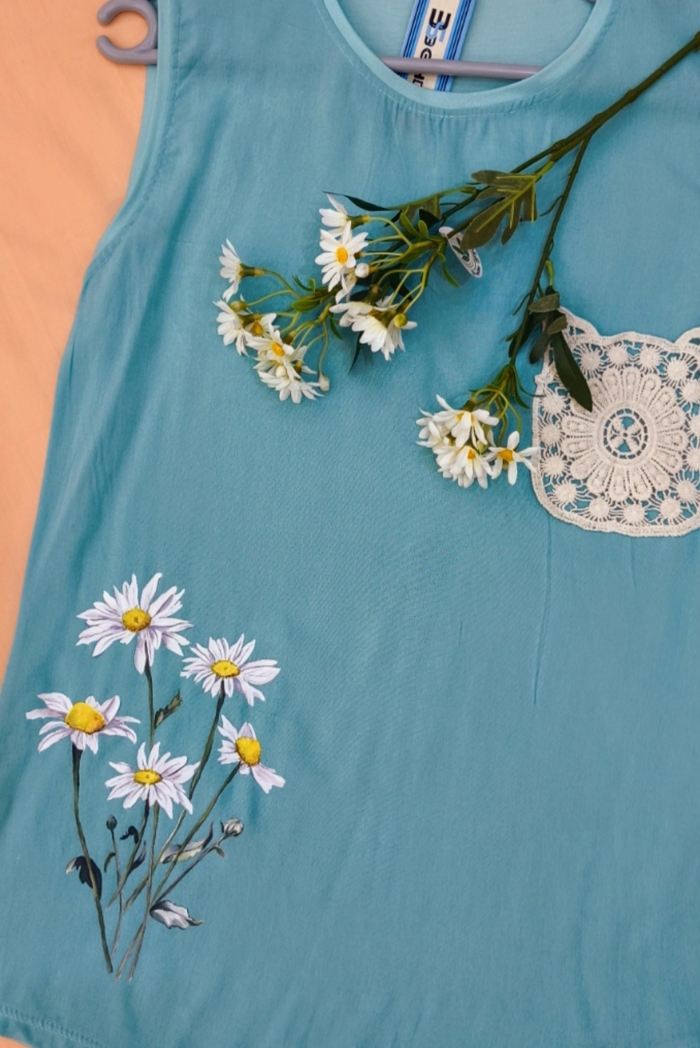 تاپ زنانه - نقاشی دستی طرح گل بابونه - رنگ ثابت و قابل شستشو. جیب تزئینی قلاببافی قد جلو ۶۴ سانتی متر قد پشت ۶۷ سانتی متر